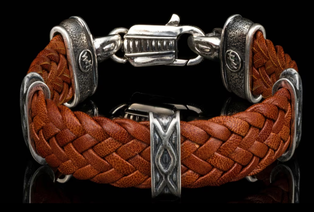 The ‘Tilt’ leather bracelet features a rich, widely woven k***aroo leather adorned with textured and patinated sterling silver details, offering a depth of appearance that is uniquely William Henry. This substantial piece showcases a level of quality and craftsmanship that is infinitely wearable and impossible to overlook.