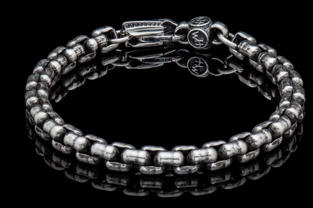 A lovely bracelet, this is our take on a classic that is an essential piece on the wrist, worn solo or stacked with other pieces. The complex geometry of each link presents as a simple, timeless piece that is finished with a gentle oxide and hand polish that beckons you closer, true to William Henry’s renowned style. Our custom lobster clasp, also sculpted in sterling silver, completes the presentation.Chain width: 7.2mm