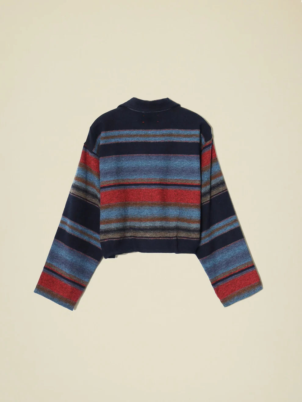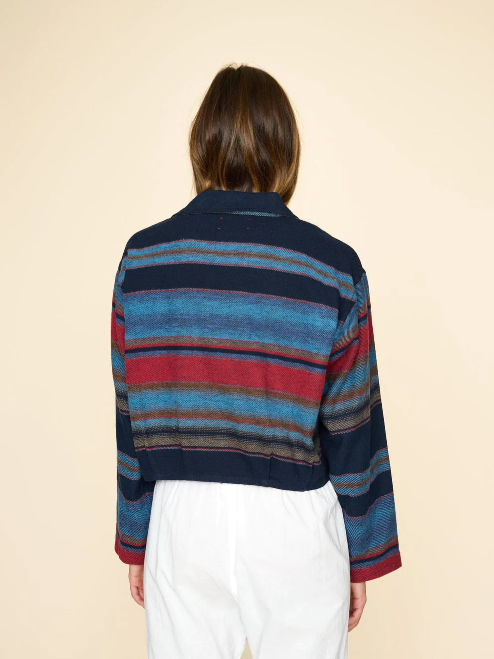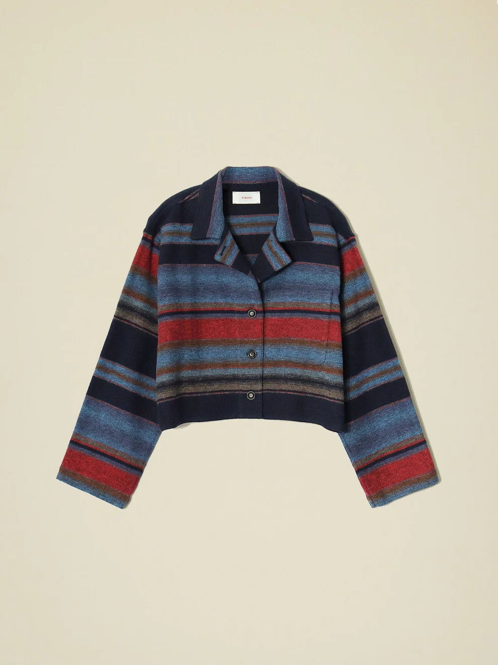 Fall in Line(s). Haven is made in our brushed cotton twill and features soft multicolor abstract stripes. Haven is a cropped button-front jacket with a spread collar, left chest patch pocket, and gentle tucks at the back.