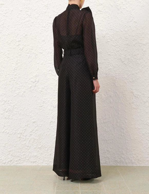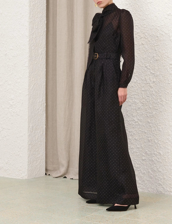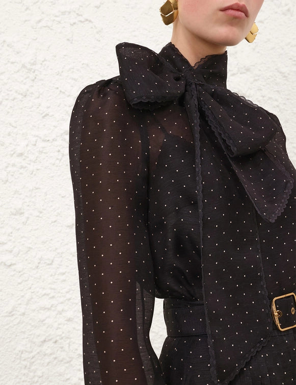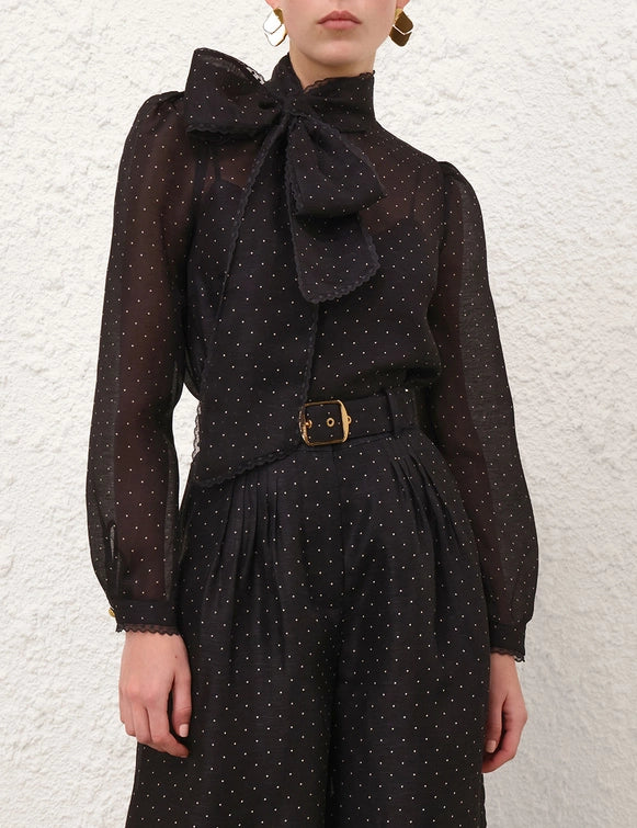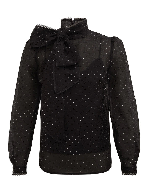 The Dream Pussybow Blouse in Black Dot from our Fall 2025 Collection, Hypnotic. A silk linen blend blouse featuring a stand collar with pussybow necktie and an invisible zip at centre back.