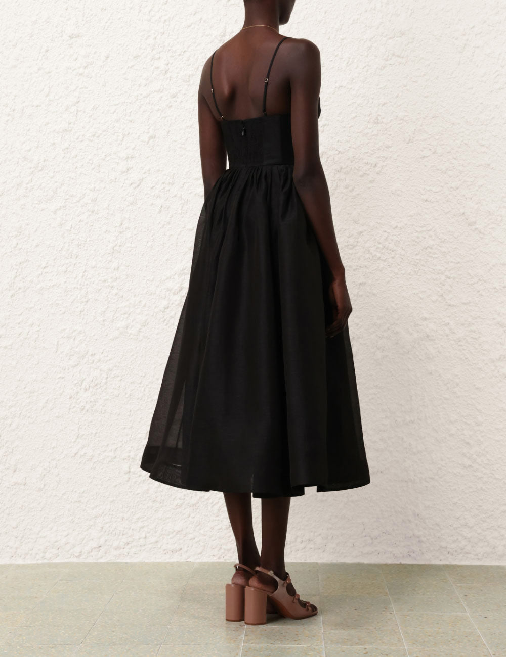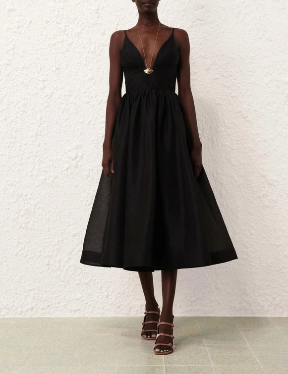 The Illustration V Neck Midi Dress in Black from our Fall 2024 Collection, In Illustration. A silk linen midi dress featuring a fitted bodice, a plunging V-neckline and a gathered waist skirt with side pockets.