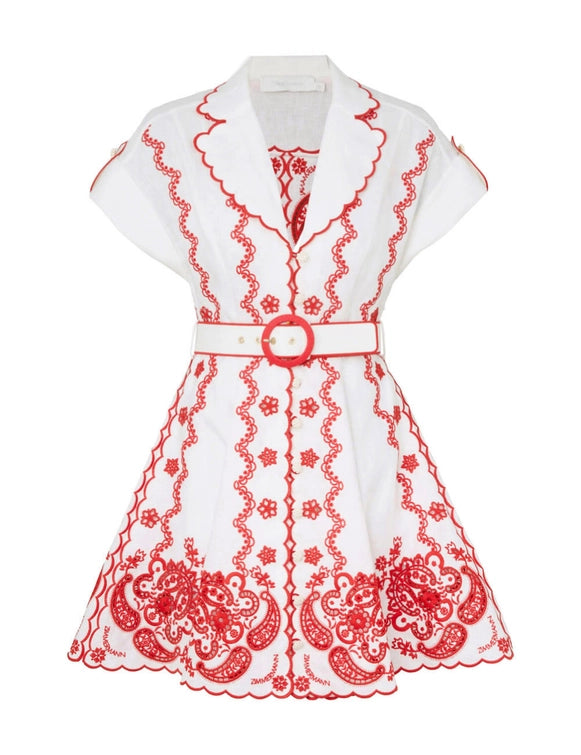 The Lucky Embroidered Mini Dress in Ivory/Red from our Summer Swim 2025 Collection. A linen mini dress featuring a plunging V-neckline, a classic collar with scalloped edging and short folded sleeves, finished with a removable belt at the waist.