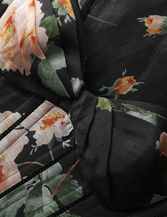The Luna Corset Midi Dress in Black Rose from our Spring 2026 Collection, Kindred Spirit. A silk-linen midi dress featuring a fitted corset bodice, sweetheart neckline, adjustable straps, finished with a centre back zip and full flare skirt.
