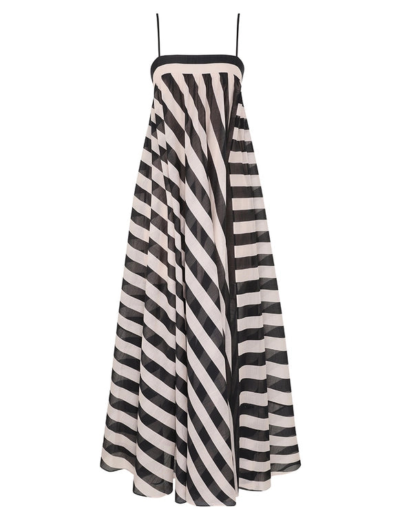 The Maxine Stripe Maxi Dress in Black/Cream Stripe from our Resort Swim 2025 Collection. A cotton maxi dress featuring a fitted bust with shirred back panel and centre back invisible zip closure.