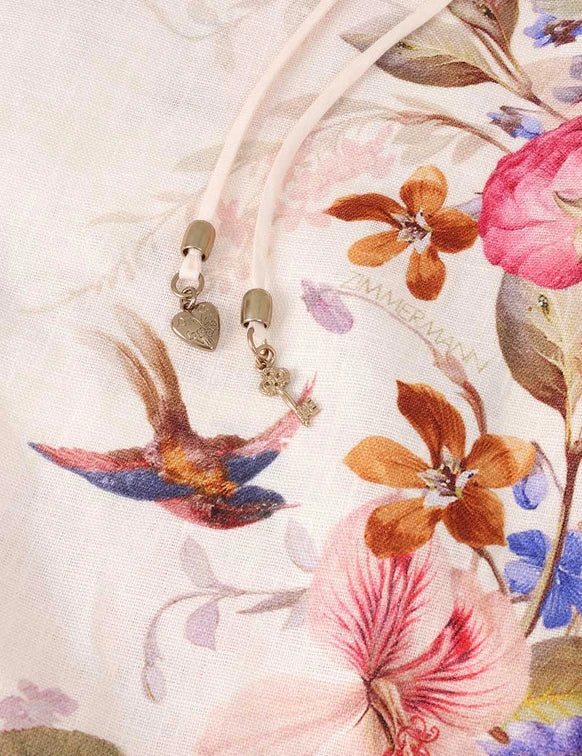 The Patience Frill Midi Dress in Vanilla Floral from our Resort Swim 2026 Collection. A linen midi dress featuring a straight-across neckline with ruffle detailing, criss-cross straps at the back, finished with side skirt splits.
