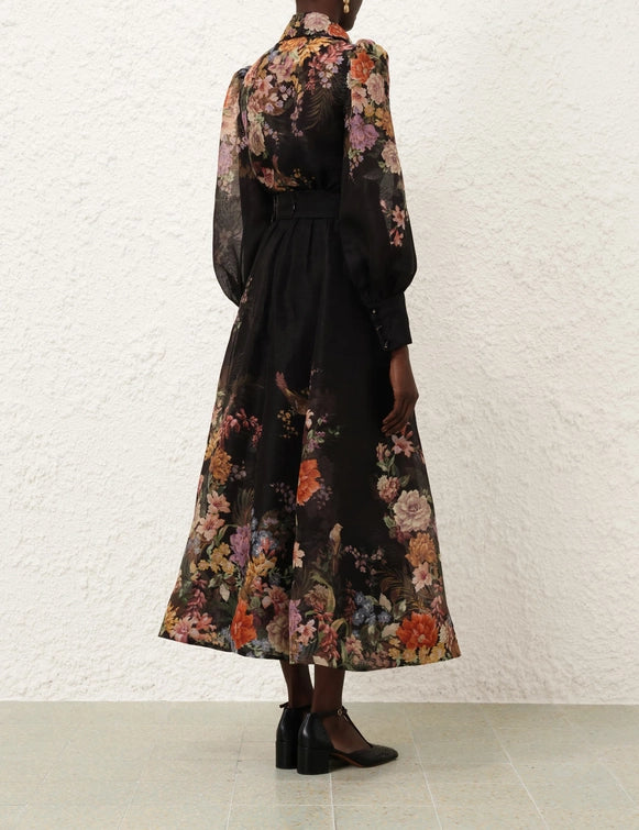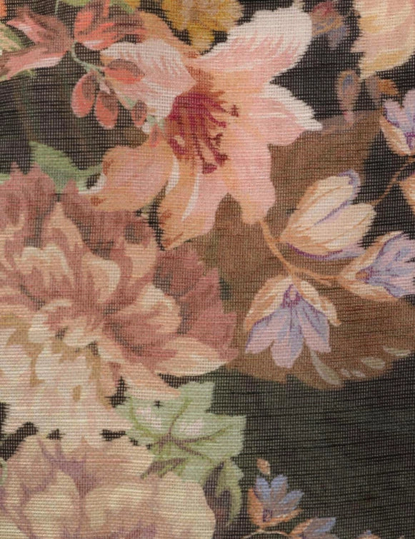 The Pavilion Tie Neck Blouse in Black Multi Floral from our Fall 2024 Collection, In Illustration. A silk linen shirt featuring long blouson sleeves, buttons down the centre front and gathered cuffs.