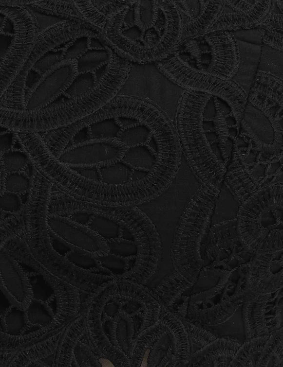 The Rhiannon Embroidered Bodice in Black from our Summer Swim 2025 Collection. A cotton cropped bodice featuring scalloped detailing, self tie straps with beaded gold accents and shirred elastic across back.
